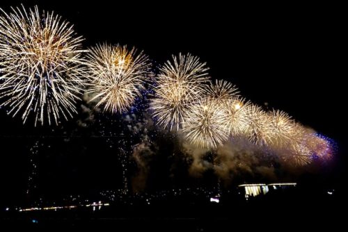 花火が始まるときには小雨も収まっており、フィナーレが終わるタイミングで